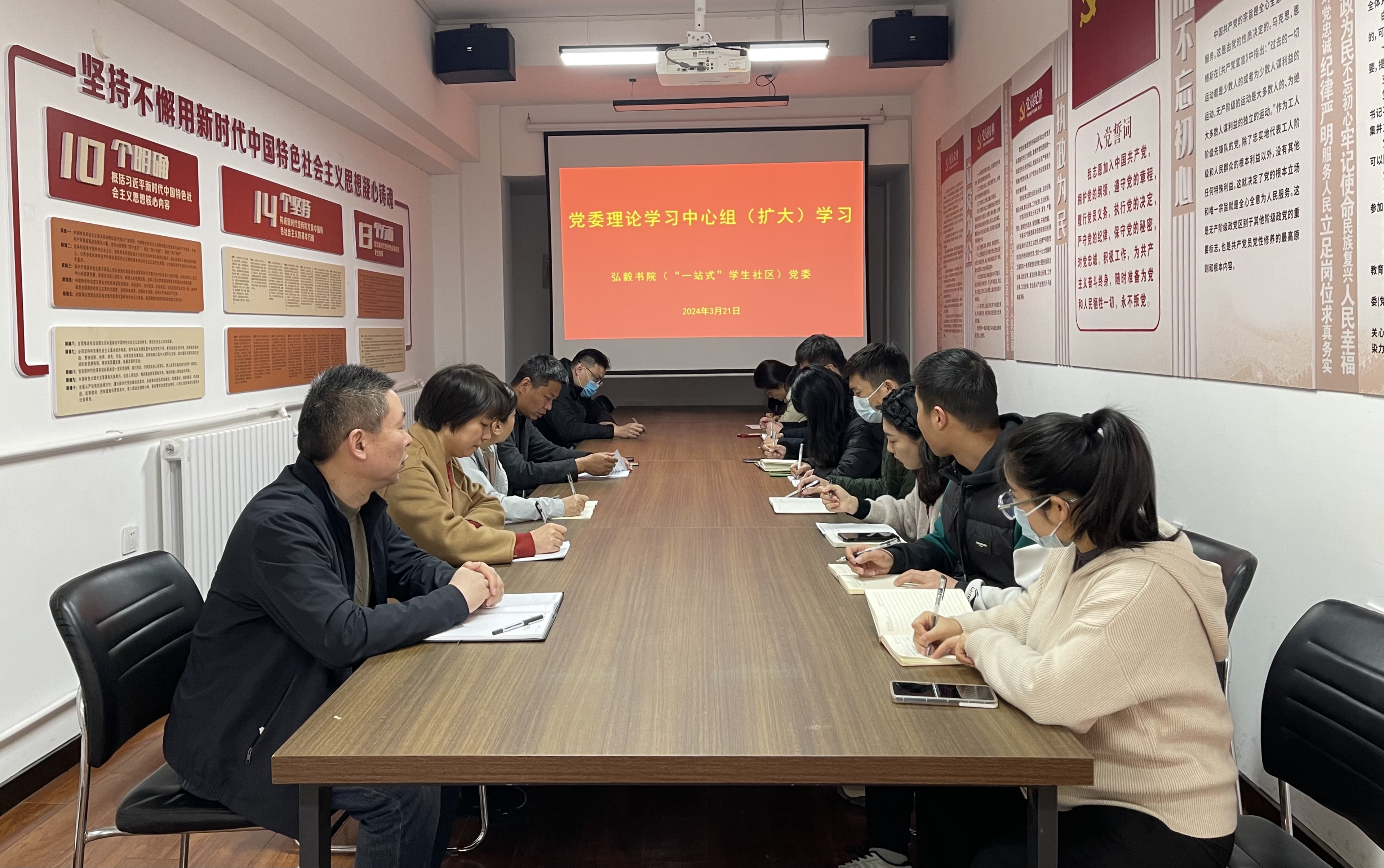 2024年3月21日上午,弘毅书院“一站式”学生社区在书院107会议室召开党委理论学习中心组(扩大)学习会议。社区党委书记李立夏,社区党委委员弘毅书院党委副书记董占奇、信息工程学院党委副书记王晓霞、电气与机械学院党委副书记白晓玉、外国语学院党委副书记陈化宇、国际与教育学院党委副书记李想等出席会议,社区部分辅导员参加会议。李立夏主持会议并讲话。