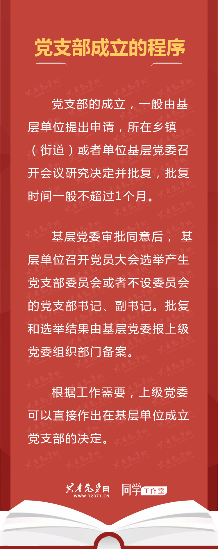党支部的成立,一般由基层单位提出申请,所在乡镇(街道)或者单位基层党委召开会议研究决定并批复,批复时间一般不超过1个月。