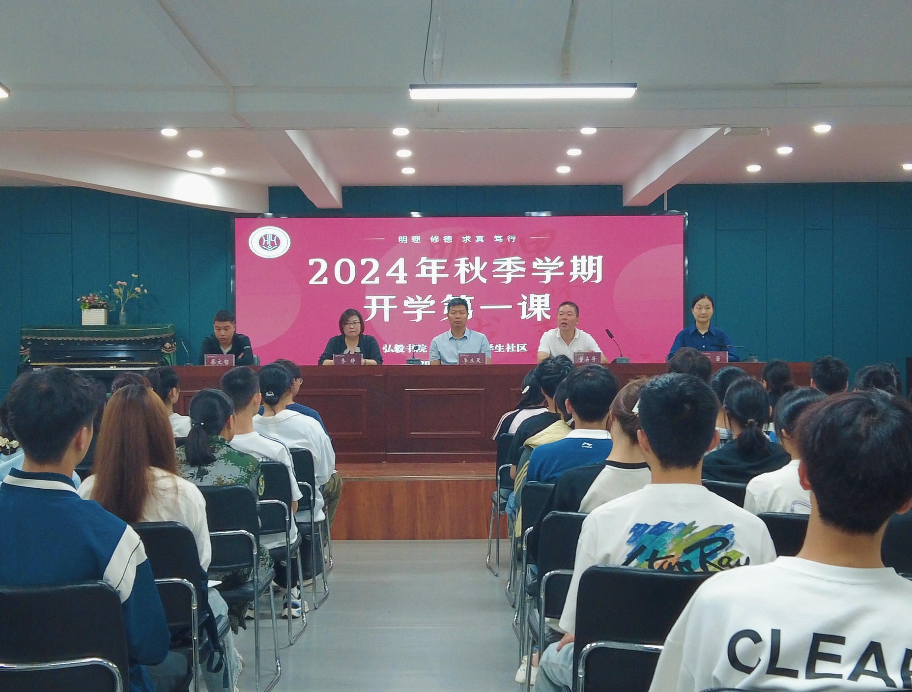 为深入学习宣传贯彻习近平新时代中国特色社会主义思想、党的二十大和二十届三中全会精神,引导师生深刻把握新时代伟大成就,增强忠诚捍卫“两个确立”、坚决做到“两个维护”的思想自觉和行动自觉,展示好、宣传好学校探索人才培养模式的新路径新成效。9月19日,弘毅书院“一站式”学生社区在书院二楼报告厅组织开展秋季开学思政第一课,社区全体教师和100余名学生代表参加。