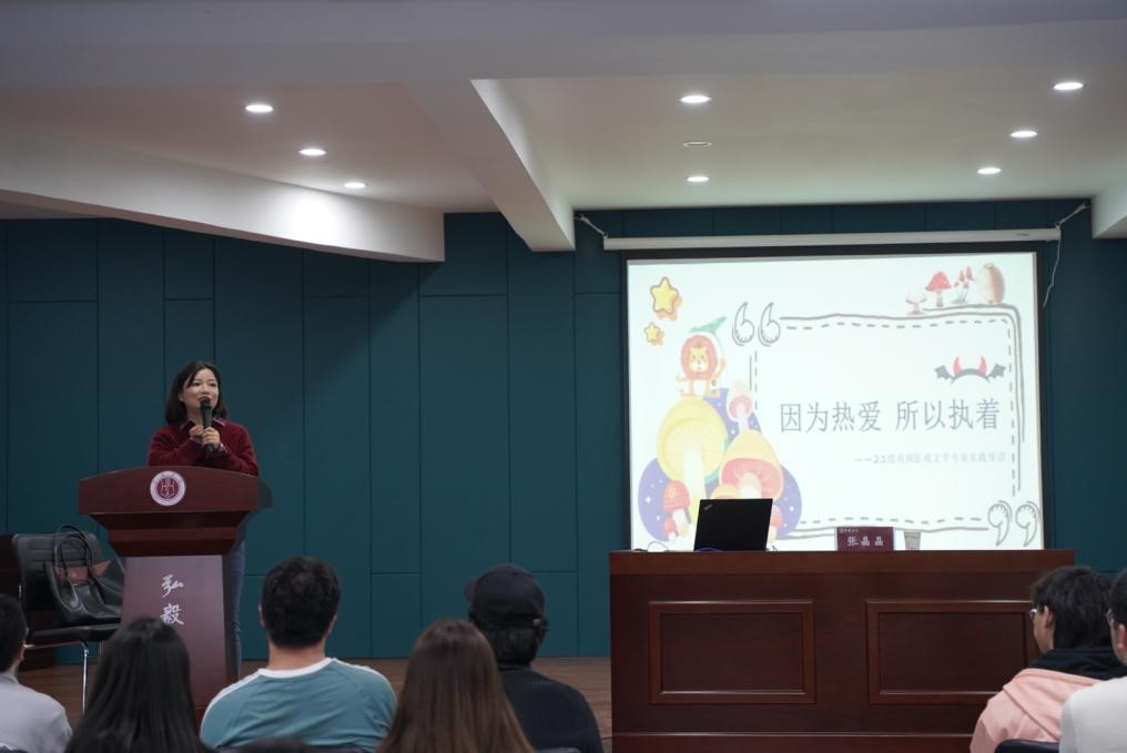 张老师以“因为热爱,所以执着”为主题,从“认识专业”、“发现自我”、“静待花开”和“花落有声”四部分展开讲授。然后认真倾听并耐心解答了同学们关于专业学习、大学生活、就业方向等方面的困惑。张老师希望同学们无论做什么事,都要明晰目标,怀揣梦想,要为了梦想而努力奋斗。最后,张老师组织同学们观看了历届毕业生优秀作品,并对新生送上了殷殷祝福。