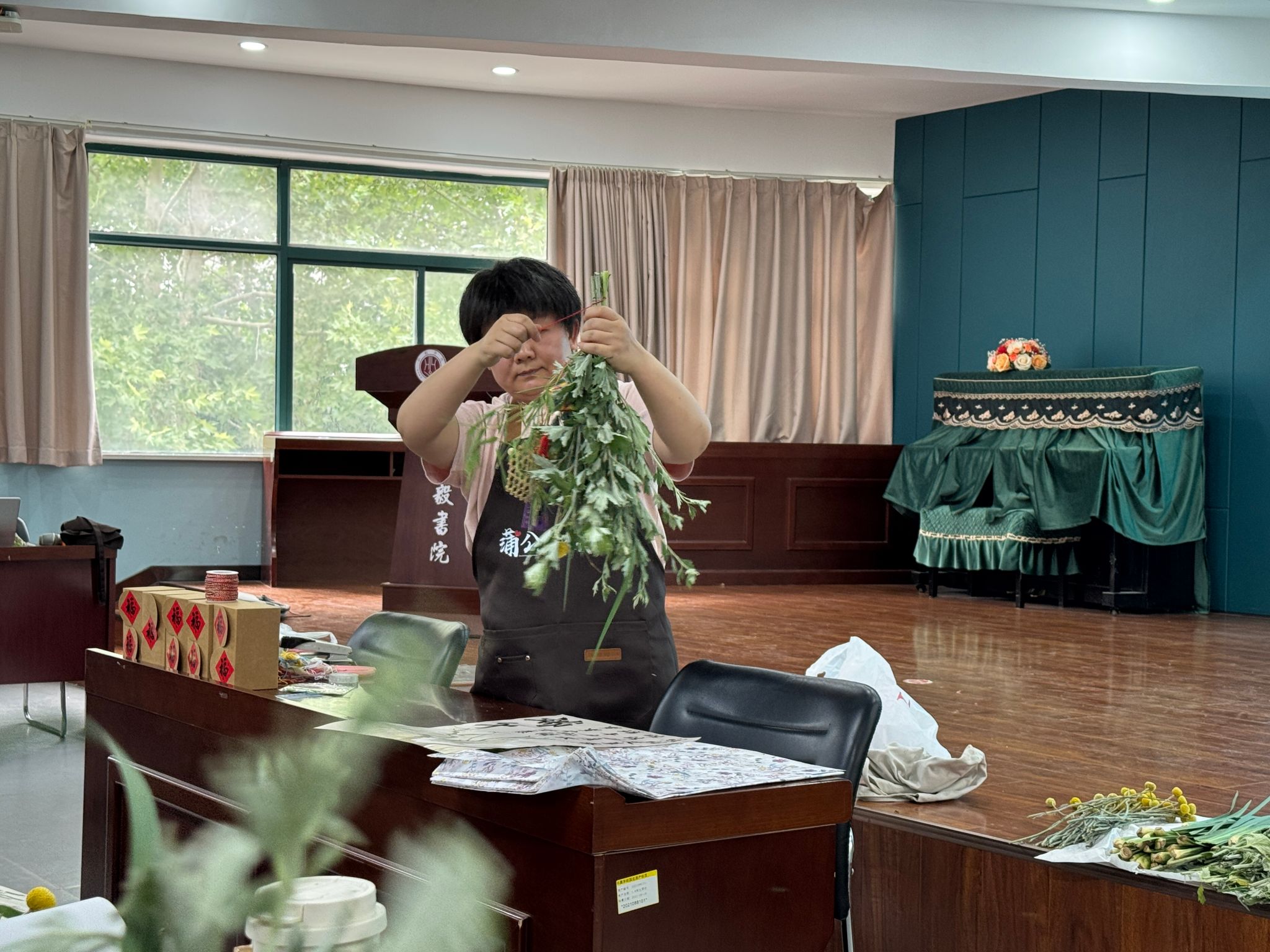 小草老师也通过亲手示范,帮助了大家如何更加巧妙地摆放艾草、菖蒲等植物。民族的优秀文化或许就是在这样的动手实践中一步一步走向未来。在这节课堂上,知识的吸收固然不可或缺,但更为深远的意义在于,它启迪着青年学子思考如何让优秀传统文化在新时代浪潮中跃动不息,使其成为滋养青年“文化自信“思想的源头活水。
