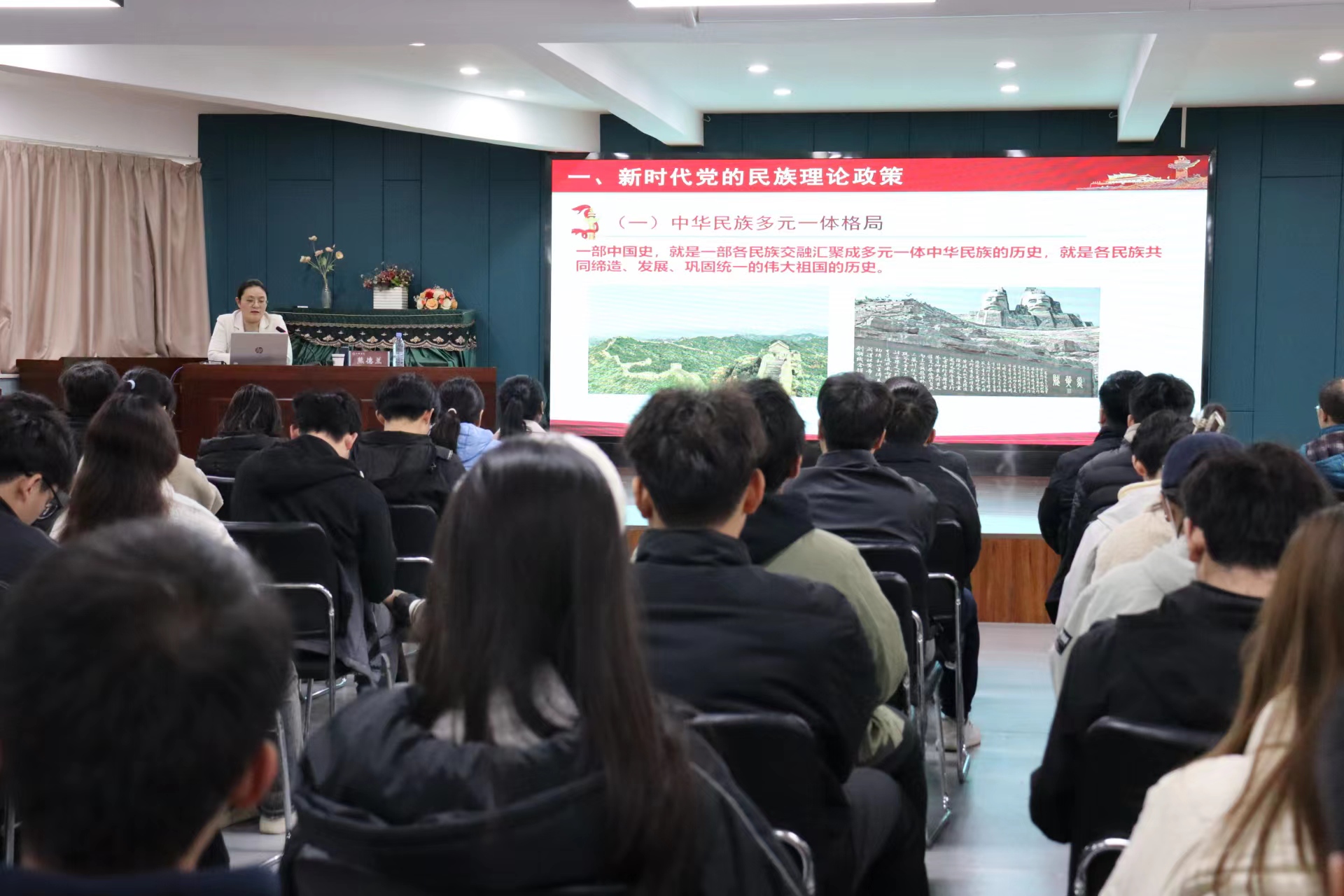 熊德兰老师详细讲解了习近平总书记关于加强和改进民族工作的重要思想、关于宗教工作的重要论述,深入浅出地诠释了党的民族宗教政策的基本原则、核心内容和重大意义。她指出,民族团结是社会稳定的前提,是经济发展和社会进步的保证,也是国家统一的基础,作为青年大学生我们要了解我国的民族宗教政策,熟悉我国的宗教法律法规。在讲到铸牢中华民族共同体意识精神内涵和深邃意义时,熊德兰老师强调,加强民族团结,必须全面贯彻党的民族宗教政策,以铸牢中华民族共同体意识为主线,坚持和完善民族区域自治制度,加强和改进党的民族工作,为促进各民族共同团结奋斗、共同繁荣发展而努力奋斗。