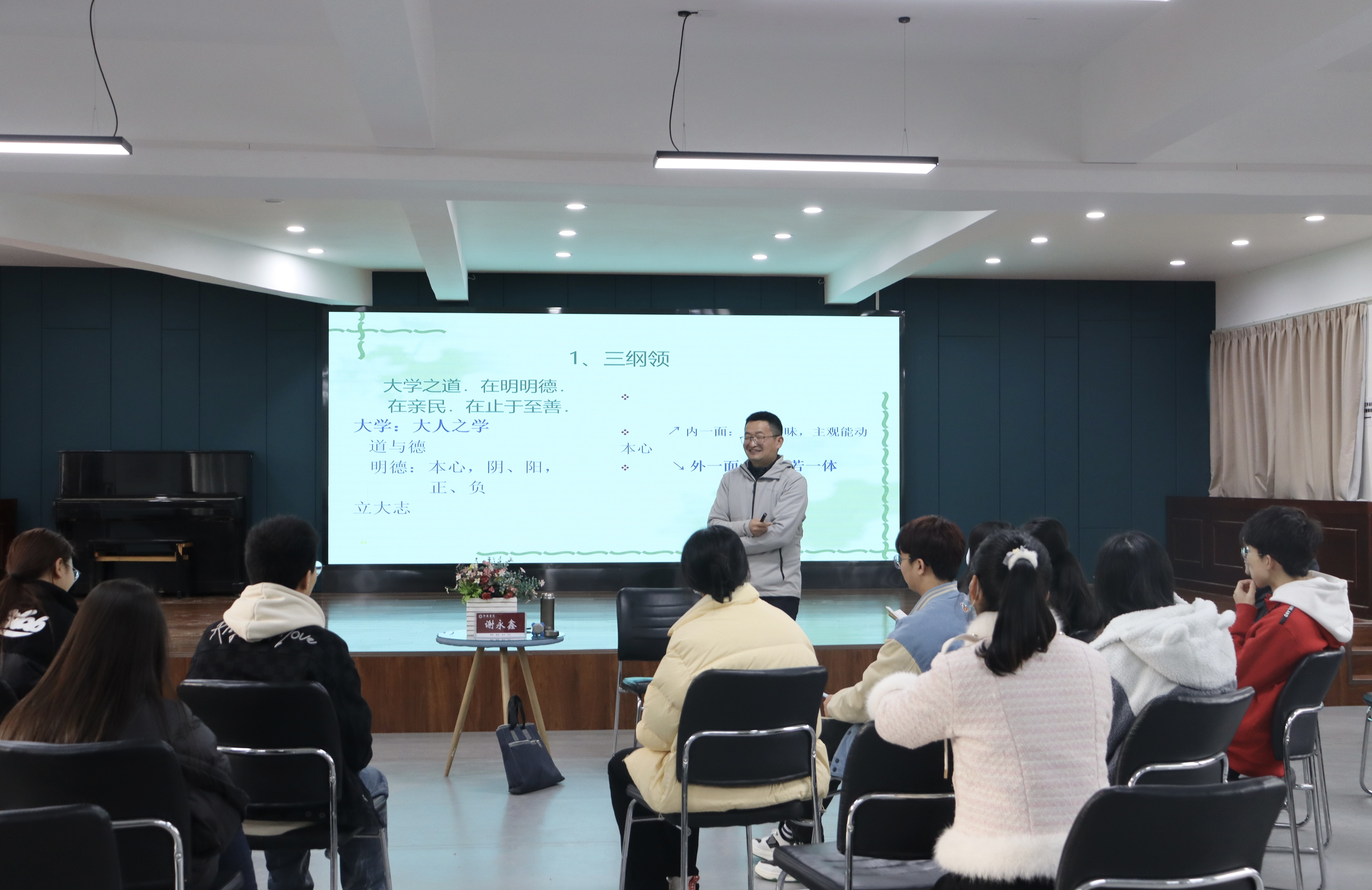 3月17日下午,弘毅书院“毅”时光读书会特邀我校马克思主义学院教师、武汉大学中国哲学专业博士、九三学社社员、副教授谢永鑫老师为书院学子讲解国学经典《大学》中的人生方向与修身工夫。
