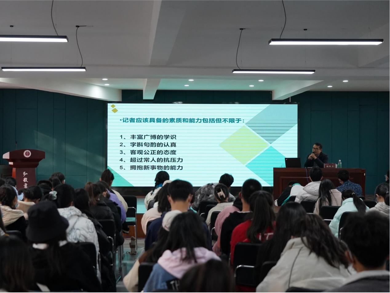杨红卫主任从为何写、怎么写、如何做三个方面与同学们展开交流。他指出写新闻一定要明白“为何写”,只有明白了“为何写”才能有持续写作的动力,才能创作出更高质量的稿件,而兴趣则是“为何写”这部分内容的核心与关键。杨主任通过四个热爱新闻事业、不怕辛劳、坚持不懈写作的真实案例给大家阐释了兴趣对于新闻写作的重要性。关于“怎么写”这一块,他详细阐述了新闻的基本概念、四要素、新闻写作的五原则,以校内外新闻稿件为例重点说明了“消息与通讯”的区别及具体写作方法。杨主任强调“如何做”是一名记者应该基本的必要素质和能力,要在日常学习生活中积累丰富广博的学识,对待新闻稿件要有字斟句酌的认真的态度,对待新闻事件要能够做到客观公正,还需要具备超越常人的抗压能力,积极拥抱新事物的能力。(图片由庞靖雯 于冰提供)