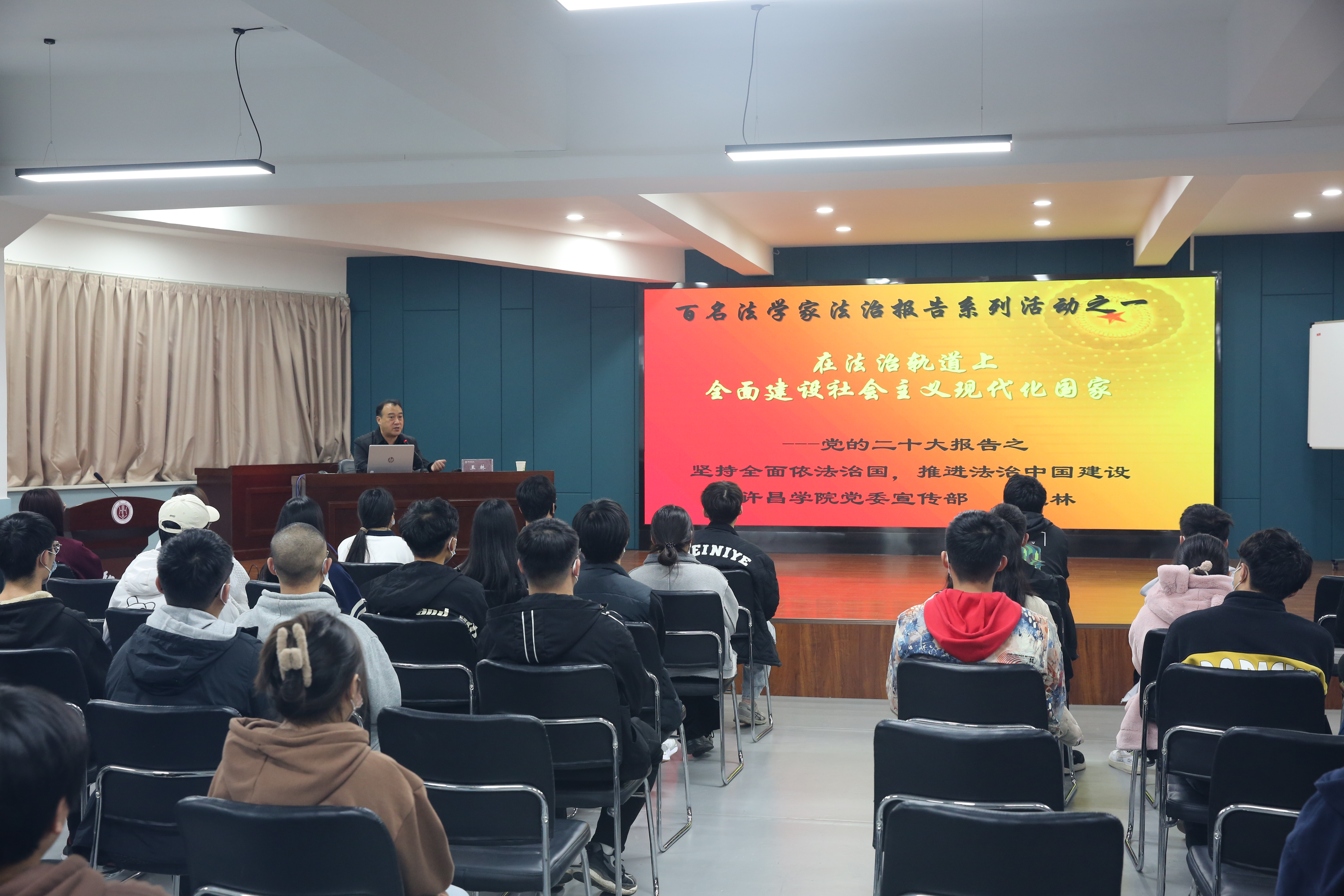 1123日下午,“弘毅大讲堂”特邀许昌学院党委委员、党委宣传部部长王林在许昌学院弘毅书院作题为《在法治轨道上全面建设社会主义现代化国家——党的二十大报告之坚持全面依法治国,推进法治中国建设》的专题讲座。此次活动在弘毅书院二楼多功能厅开展,书院学生代表参加。