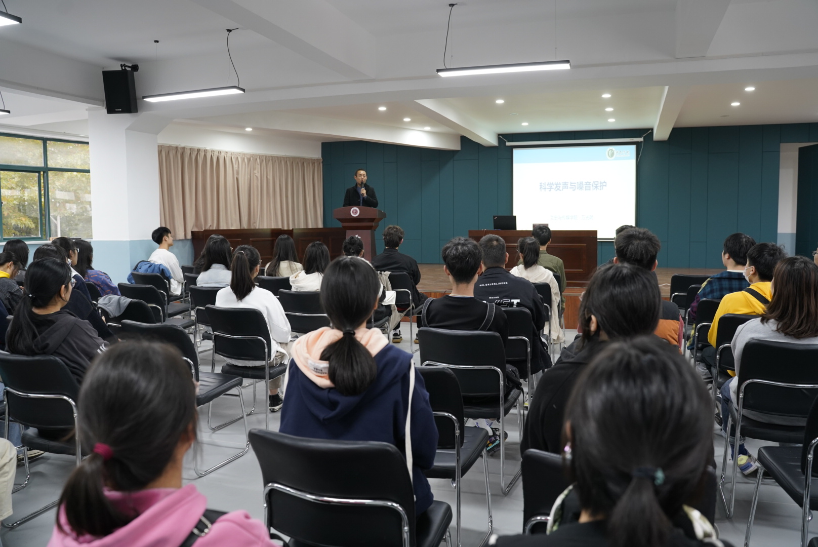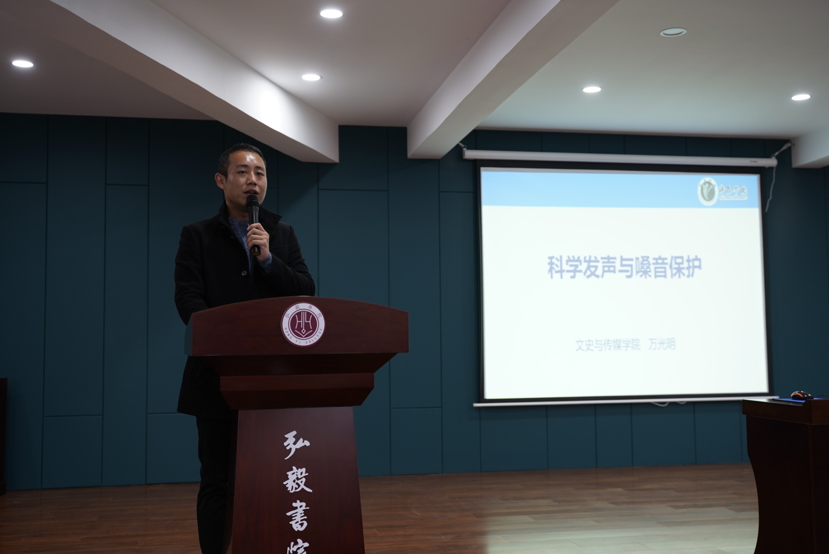 10月26日下午16:00,“弘毅大讲堂”第3讲于弘毅书院二楼多功能厅举行,特邀许昌学院文史与传媒学院播音与主持艺术专业教师、河南省普通话测试员万光明老师主讲。此次讲座的主题是《科学发声与嗓音保护》,弘毅书院学生代表及老师聆听了此次讲座。