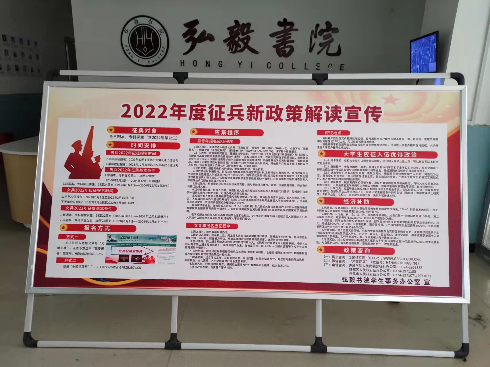 弘毅书院以最新入伍政策规定为依据,通过多种渠道,采取多种形式,充分调动大学生参与和支持征兵工作的积极性,激发广大青年大学生应征参军热情,确保征兵工作顺利开展。