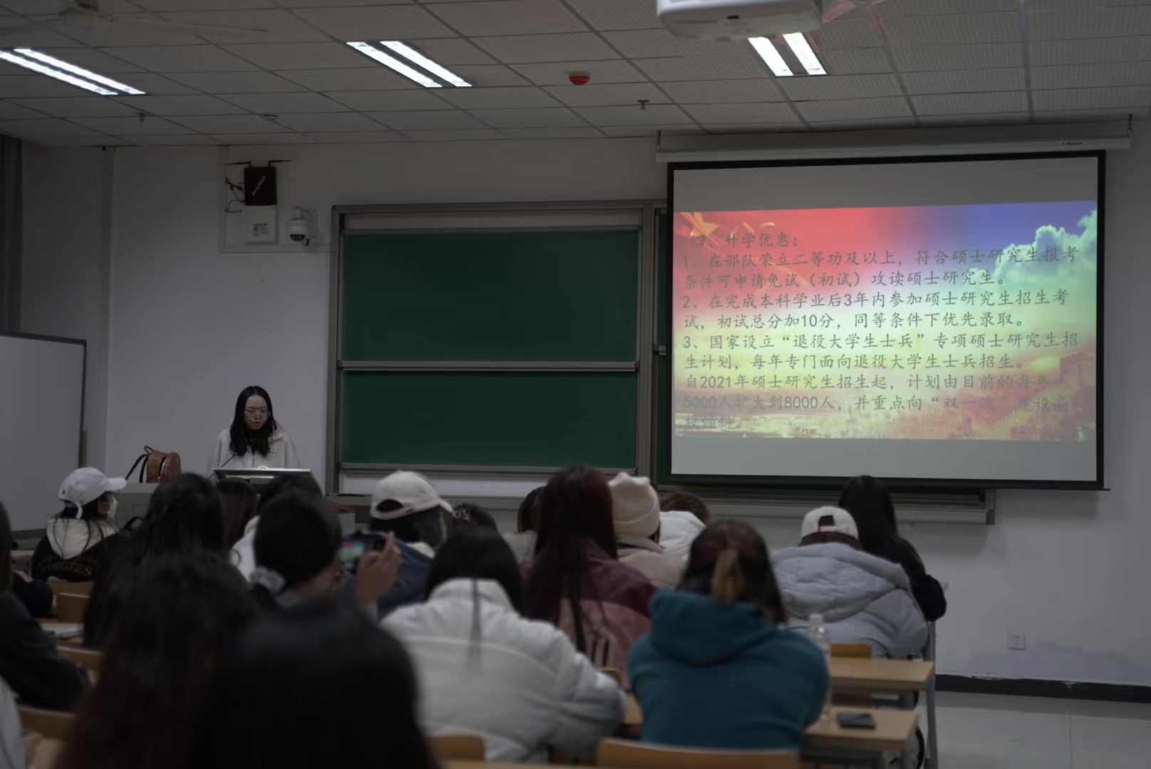 活动现场,书院各位辅导员老师结合国家周围的安全形势引入宣讲主题,给同学们讲解了国防安全及国防动员,入伍基本要求,入伍优待政策以及退伍优待政策。辅导员老师们也向学生强调:作为新时代的青年学子,要把爱国之心化为报国之行,在军营挥洒汗水,施展才华,扛起新时代赋予我们的强国使命;要将个人理想和国家前途紧密相连,用青春才智奋进强国征程,用青春志气谱写壮丽华章,积极投身热血军营,实现中国梦、强军梦、青春梦。