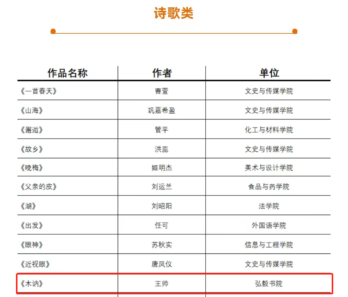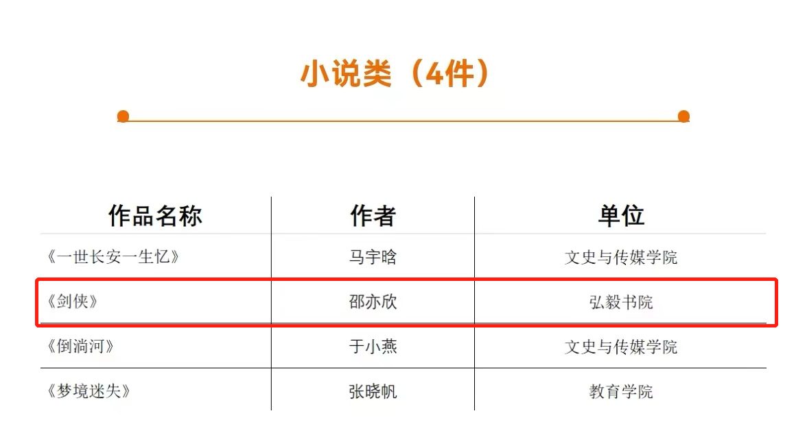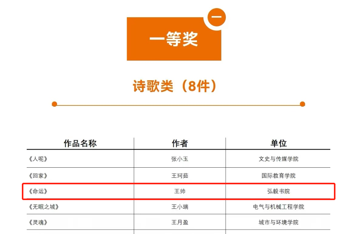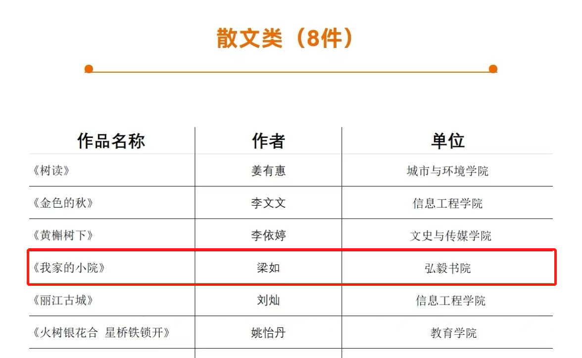 近日许昌学院“苗圃杯”校园文学创作大赛落下帷幕,我院学生在本次比赛中取得不菲成绩,弘毅书院共4部作品获奖,王帅的《命运》和《木讷》分别获得诗歌类一等奖和二等奖,梁如的《我家的小院》获得散文类二等奖,邵亦欣的《剑侠》获得小说类二等奖。