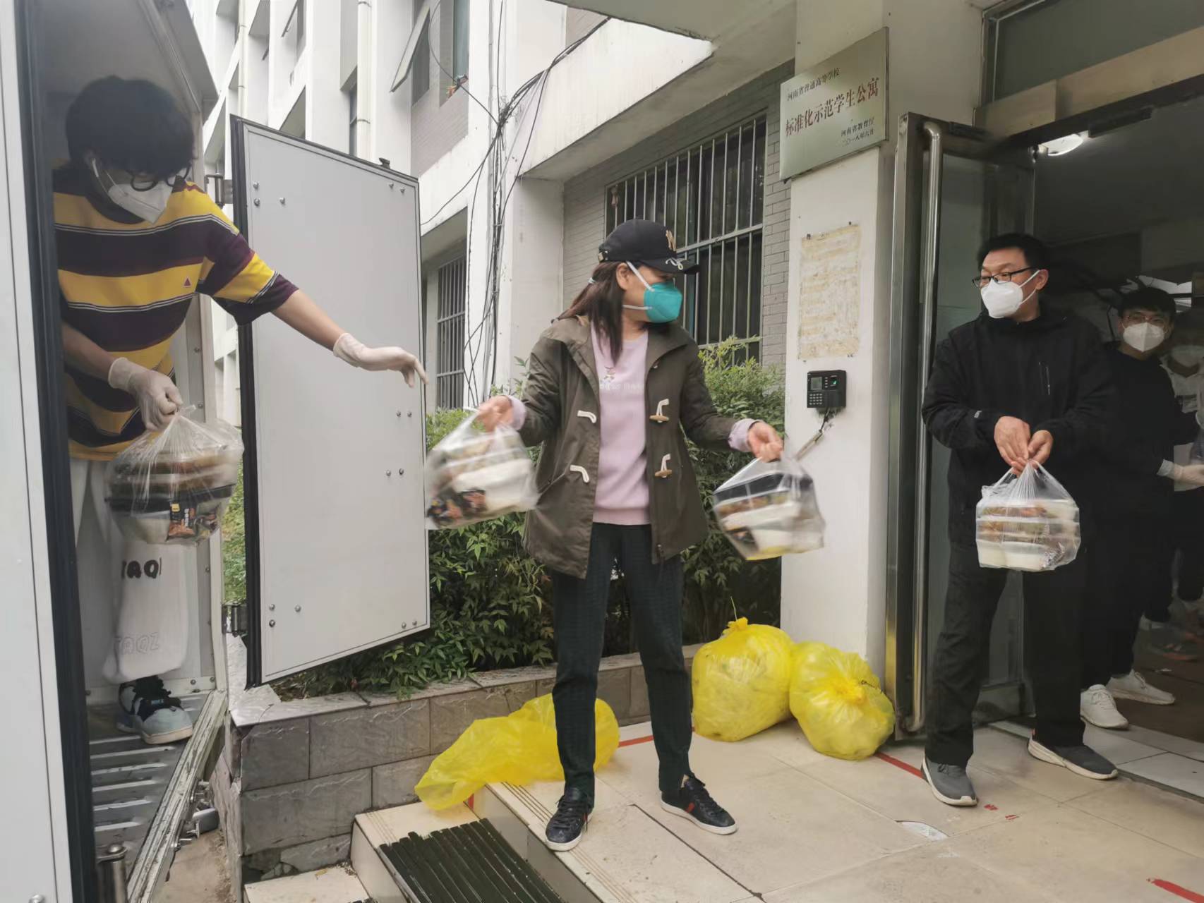 在与病毒的较量中必须与时间赛跑!无论是一日三餐配送还是每日两次入室核酸检测,无论是抗疫物资卸车,还是分发、送至宿舍,都是在争分夺秒;为保证学生们能按时吃上热饭,他们马不停蹄地分餐送餐,宁愿吃冷菜凉饭,队员们多数是专兼职辅导员,经常忙到半夜,有时接近凌晨才能对付一口。他们连续奋战,虽疲劳不堪,但也顾不上喝口水、歇歇脚,心中只有一个信念:尽可能早地将病毒圈住封死捞干扑灭,保护好每一位学生的健康和安全!