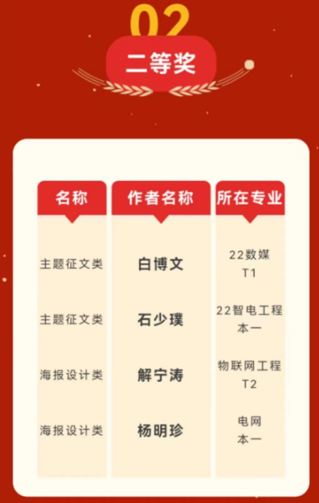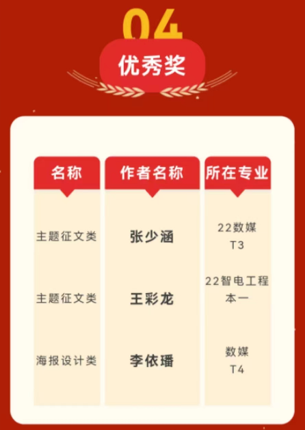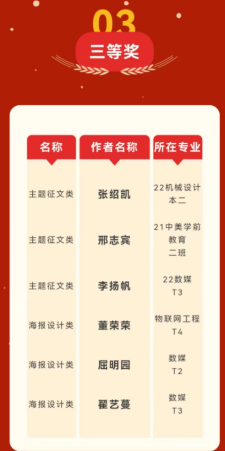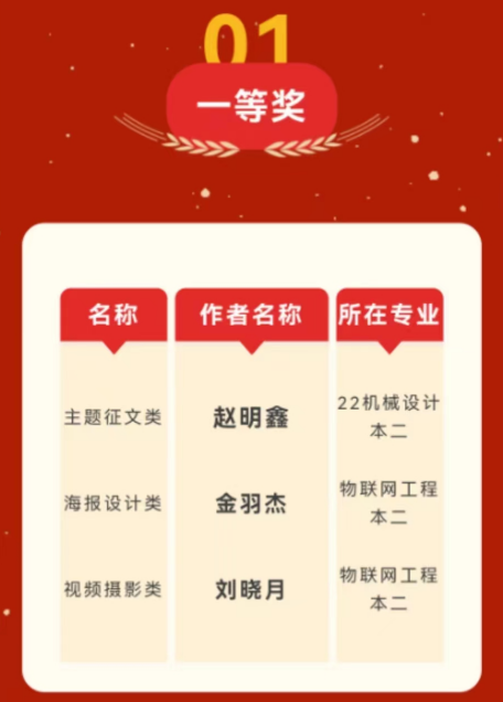 为了营造学习二十大的浓厚氛围,深入宣传新时代新成就,进一步引导大学生在新时代坚定理想信念,10月20日至10月30日,弘毅书院举行“青春献礼二十大”系列征集活动。经过专家评审团的评比,最终22级机械设计本2班赵明鑫,22级物联网工程本2班金羽洁和22级物联网工程本2班刘晓月分别荣获主题征文类、海报设计类和视频摄影类一等奖。