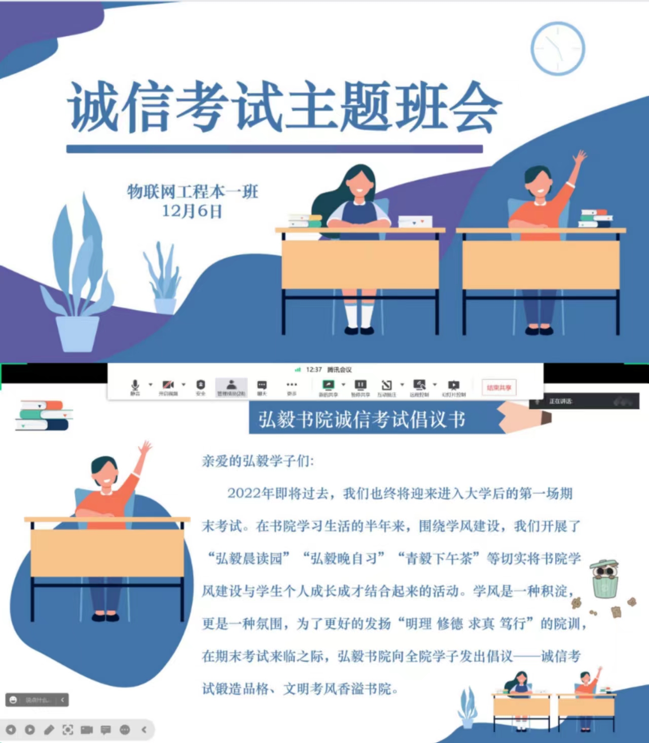 据悉,弘毅书院自12月初便组织诚信考试主题教育,在微信公众号上推送“弘毅书院诚信考试倡议书”,辅导员老师组织各专业开展诚信考试主题班会,内容丰富,形式多样。因疫情影响,主题班会以线上形式为主,首先由辅导员老师介绍考试形式、考试要求;其次,班委领读“弘毅书院诚信考试倡议书”,强化同学们对诚信考试的理解与认识;最后,邀请高年级优秀学长/学姐、班级内优秀学生分享期末大考前的复习经验与技巧。