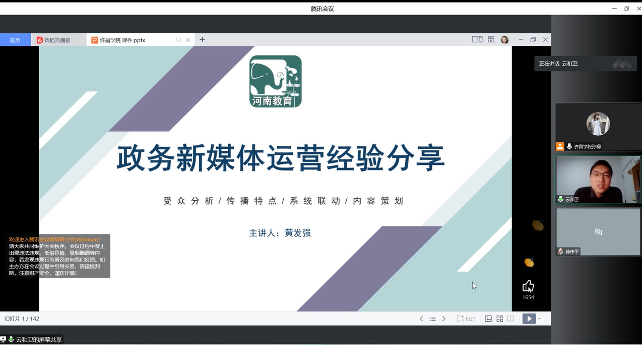 本次讲堂特别邀请了河南教育新闻中心副主任黄发强,主题是《政务新媒体运营经验分享》。活动由党委宣传部副部长钟伟平主持,学校组织各单位新媒体宣传队伍、校媒团体、网络文化工作室指导教师及学生骨干共约300人参与学习。