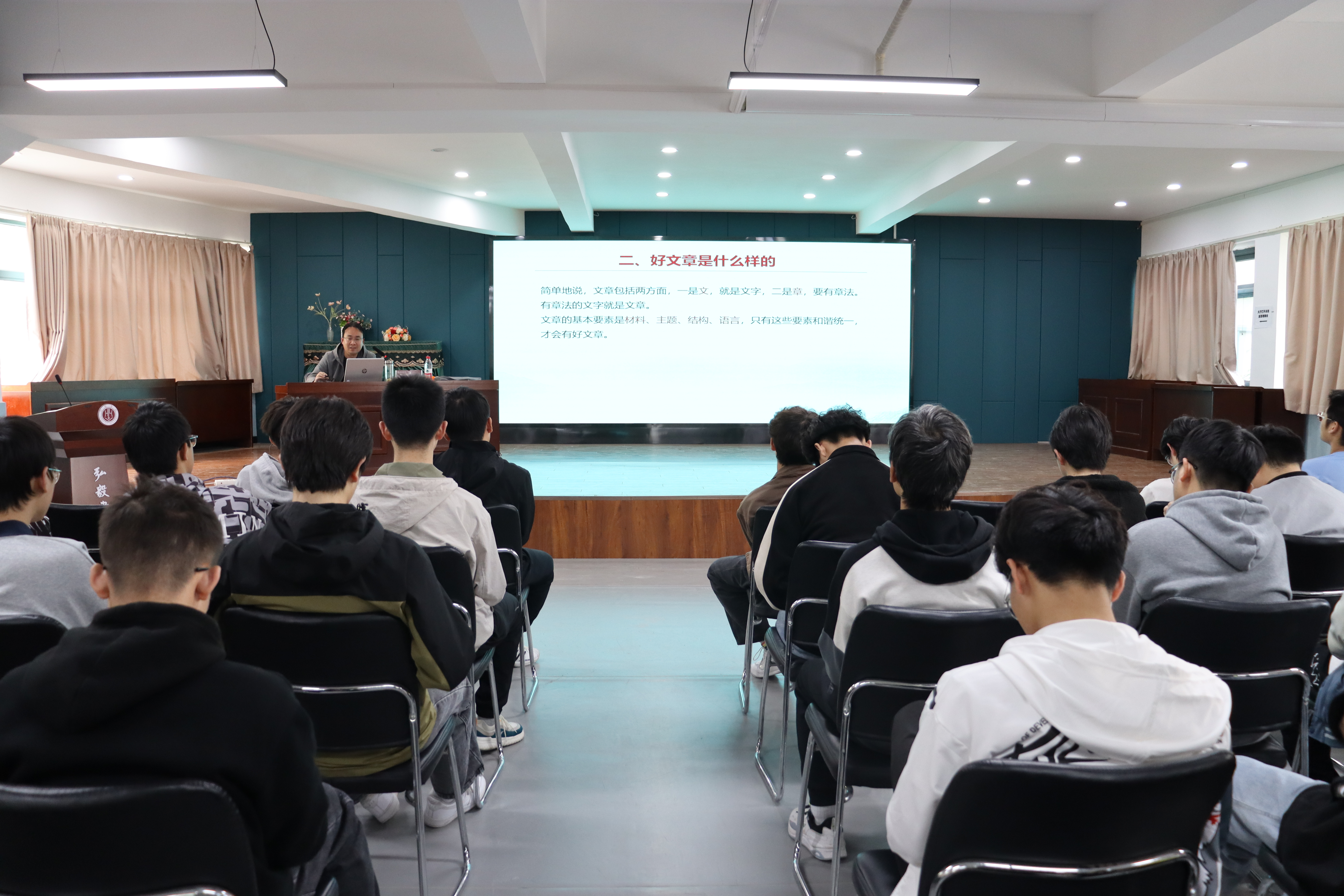 高凯老师从自身的工作经历讲起,运用通俗易懂、风趣幽默的语言重点解析了“为什么要写好文章”“好文章是什么样的”“怎么能写出好文章”三部分的内容。他讲到,文章的基本要素是材料、主题、结构、语言,只有这些要素和谐统一,才会有好文章,而想要把好文章变得更优秀,就需要中心突出、内容丰厚、结构严谨、条理清晰、语言流畅。他叮嘱同学们,要想写出好文章一要善积累,多读,做到脑中有货;二要勤琢磨,善思,做到心中有谱;三要多修改,勤练,做到笔下有力。