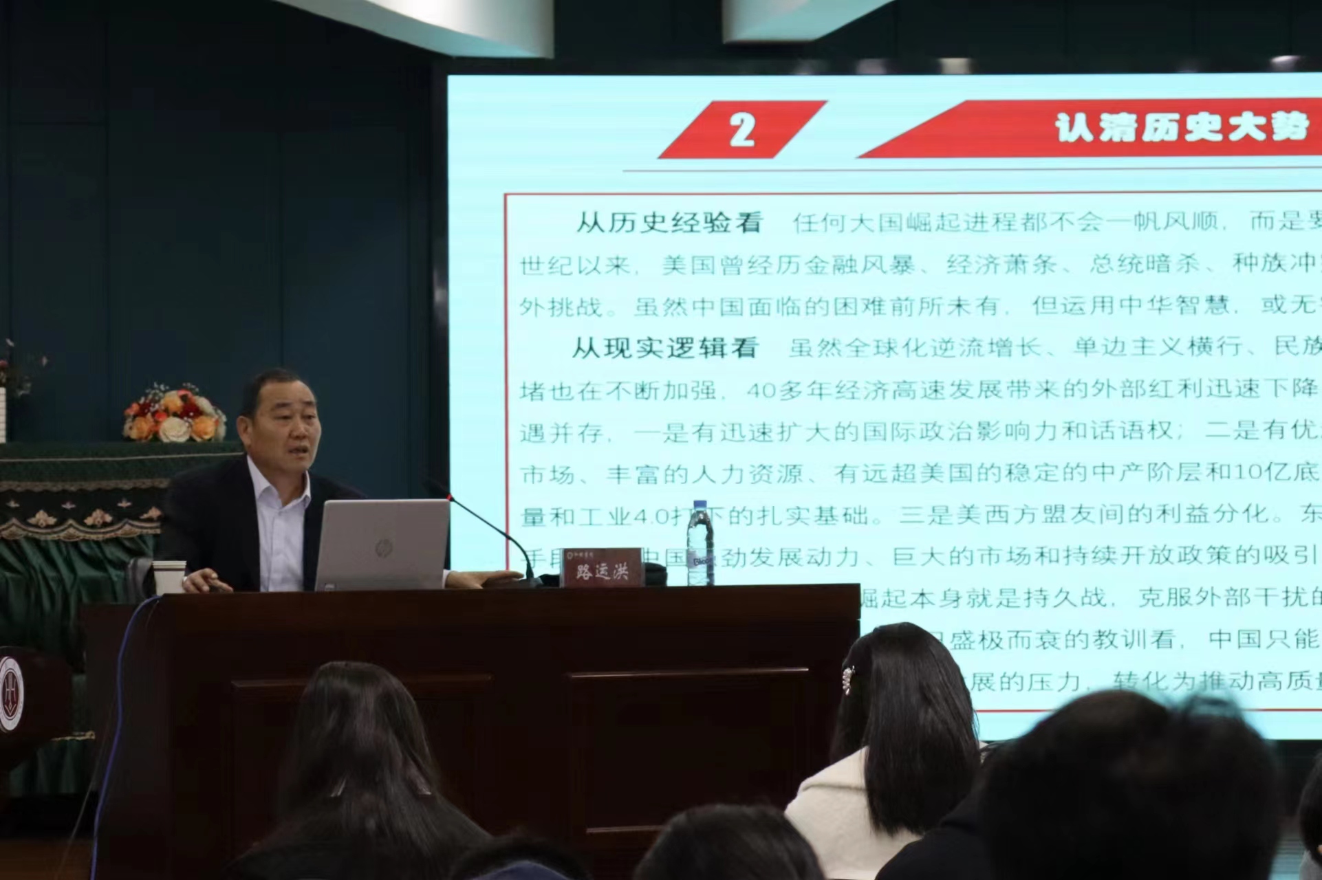 路老师以习近平总书记所提到的“百年未有之大变局”的概念为切入点,深入剖析了“大变局”这个概念。他指出,大变局是国际局势的重要特征,是我们面临的重要挑战,也是我们抓住机遇、推动发展的重要契机。他从经济、科技、文化等多个方面阐述了当前世界大变局的现状及未来趋势。路老师引用了大量实例和数据,深入浅出地揭示了世界大变局背后的深层原因和逻辑,他强调,随着全球化进程的加速和科技的快速发展,世界各国的经济、政治、文化等都在发生深刻变革,这些变革不仅对各国的发展产生深远影响,也对全球治理提出了新的挑战。他指出,在这个大变局的时代背景下,我们需要保持清醒的头脑,理性应对各种挑战,积极探索新的发展路径,以实现中华民族伟大复兴的中国梦。