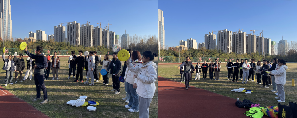 本次活动邀请体育学院李学良老师进行现场指导教学。活动开始前,李老师为大家讲解了飞盘运动的基础知识,如何抓握飞盘、如何摆动手腕、如何调转身体等,生动形象的讲解和手把手的传授,让同学们逐步掌握飞盘动作要领,也激发了大家对飞盘运动的兴趣。大部分同学都是第一次接触飞盘运动,经过讲解和熟练之后,大家摩拳擦掌、跃跃欲试,开启了一场酣畅淋漓的飞盘比赛。