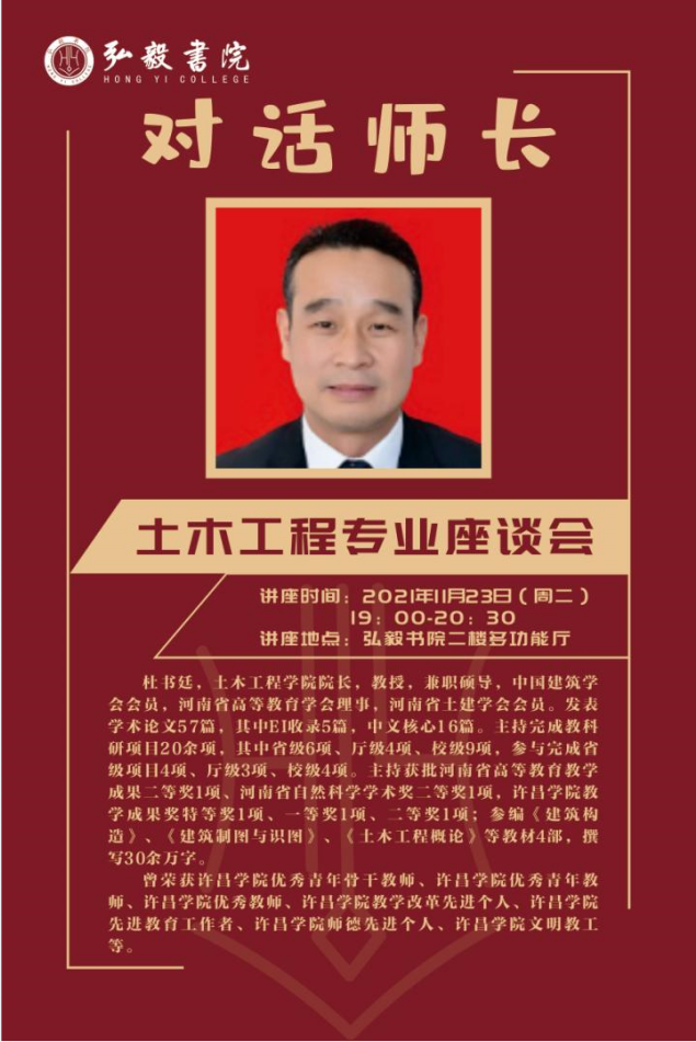 杜书廷,土木工程学院院长,教授,兼职硕导,中国建筑学会会员,河南省高等教育学会理事,河南省土建学会会员。发表学术论文57篇,其中EI收录5篇,中文核心16篇。主持完成教科研项目20余项,其中省级6项、厅级4项、校级9项,参与完成省级项目4项、厅级3项、校级4项。主持获批河南省高等教育教学成果二等奖1项、河南省自然科学学术奖二等奖1项,许昌学院教学成果奖特等奖1项、一等奖1项、二等奖1项;参编《建筑构造》、《建筑制图与识图》、《土木工程概论》等教材4部,撰写30余万字。