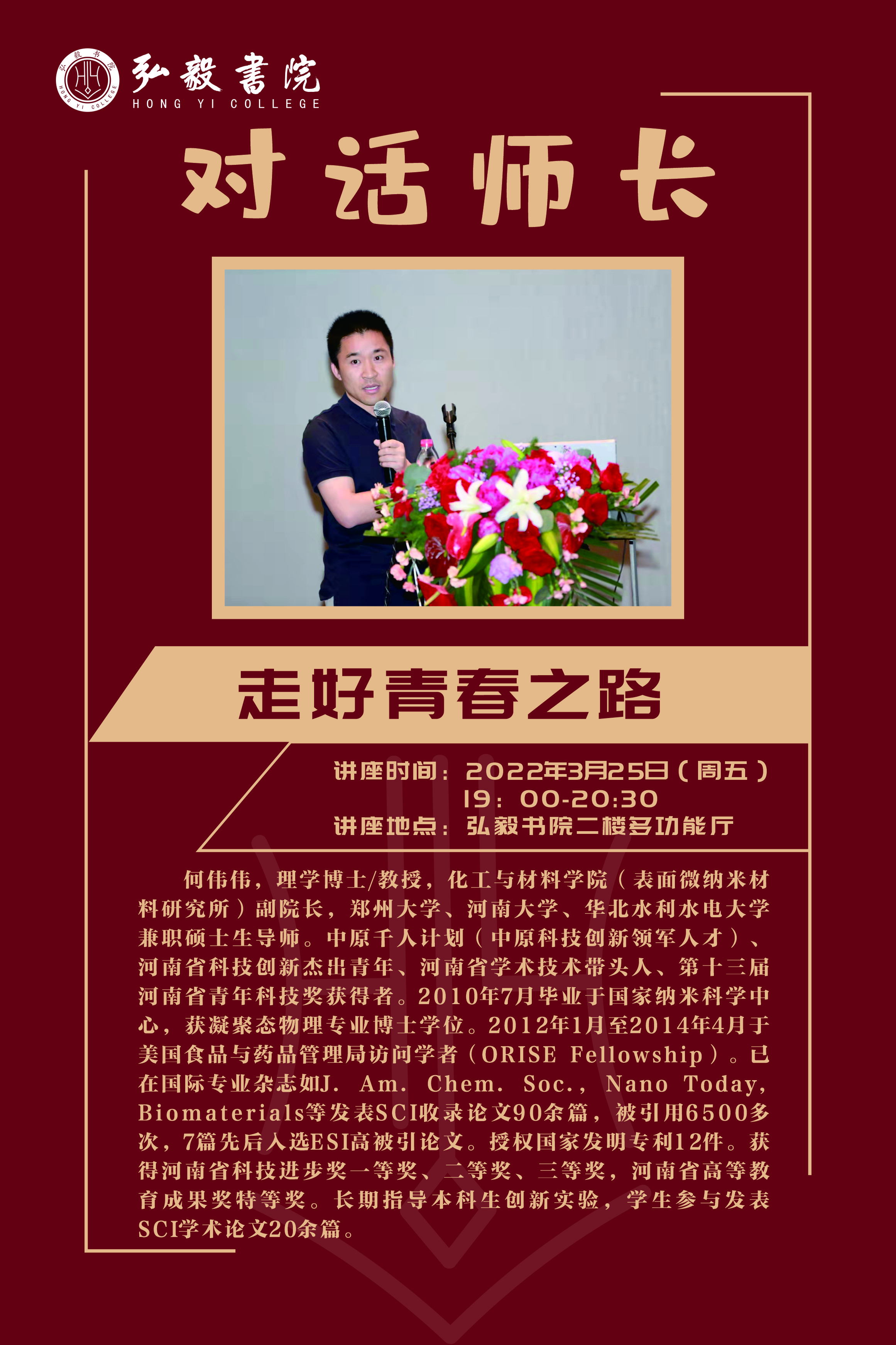 何伟伟,理学博士/教授,化工与材料学院(表面微纳米材料研究所)副院长,郑州大学、河南大学、华北水利水电大学兼职硕士生导师。中原千人计划(中原科技创新领军人才)、河南省科技创新杰出青年、河南省学术技术带头人、第十三届河南省青年科技奖获得者。2010年7月毕业于国家纳米科学中心,获凝聚态物理专业博士学位。2012年1月至2014年4月于美国食品与药品管理局访问学者(ORISE Fellowship)。已在国际专业杂志如J. Am. Chem. Soc., Nano Today, Biomaterials等发表SCI收录论文90余篇,被引用6500多次,7篇先后入选ESI高被引论文。授权国家发明专利12件。获得河南省科技进步奖一等奖、二等奖、三等奖,河南省高等教育成果奖特等奖。长期指导本科生创新实验,学生参与发表SCI学术论文20余篇。