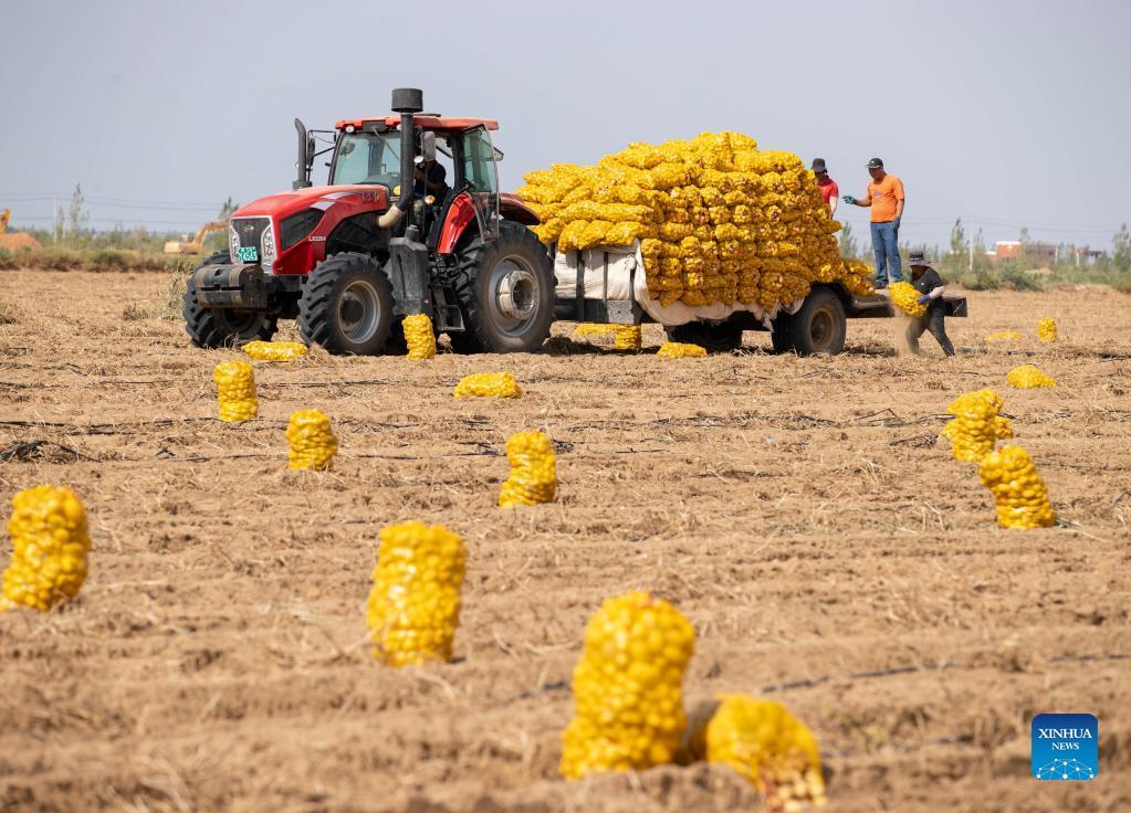 Farmers load potatoes onto a carrier in Hongrui village of Pingluo county, Shizuishan, Northwest China's Ningxia Hui autonomous region, Sept 2, 2021. Pingluo developed potato planting industry in recent years to help local villagers increase income. [Photo/Xinhua]