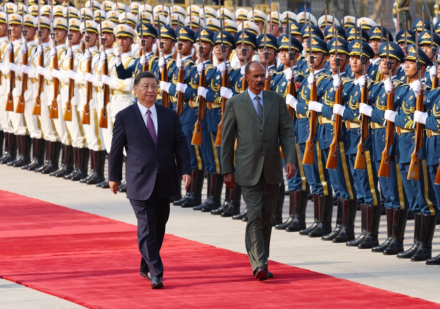 伊萨亚斯抵达时,礼兵列队致敬。两国元首登上检阅台,军乐团奏中厄两国国歌,天安门广场鸣放21响礼炮。伊萨亚斯在习近平陪同下检阅中国人民解放军仪仗队,并观看分列式。